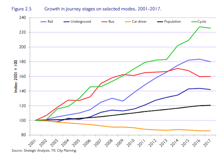 Several factors have contributed. The boom in online shopping increased the number of delivery vans on London’s streets: in 2012 they drove 3.8 billion kilometres, and in 2017, 4.8 billion – a 26% rise. Also, private-hire services such as Uber have seen an explosion in the number of registrations – up 75% from 2013 to 2017. Another challenge is the reduction in road space. Road capacity for motorists is reduced due to temporary construction work in some areas, as well as the road space relocation aimed to improve facilities for cyclists, pedestrians and taxis.