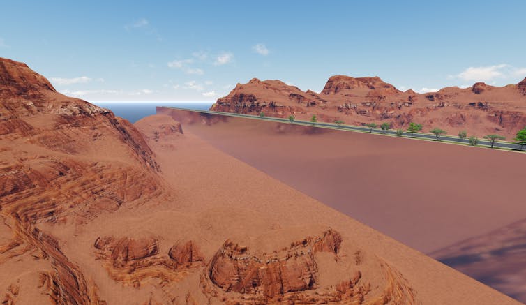 A key part of the plan is “The Line”, a A$725 billion futuristic city designed to house 9 million residents. It comprises a mirrored, wall-like structure 200 metres wide and 500 metres tall. To be built in Saudi Arabia’s north-western Tabuk province, the project will extend 170 kilometres inland from the Red Sea across coastal desert, mountain and upper valley landscapes.